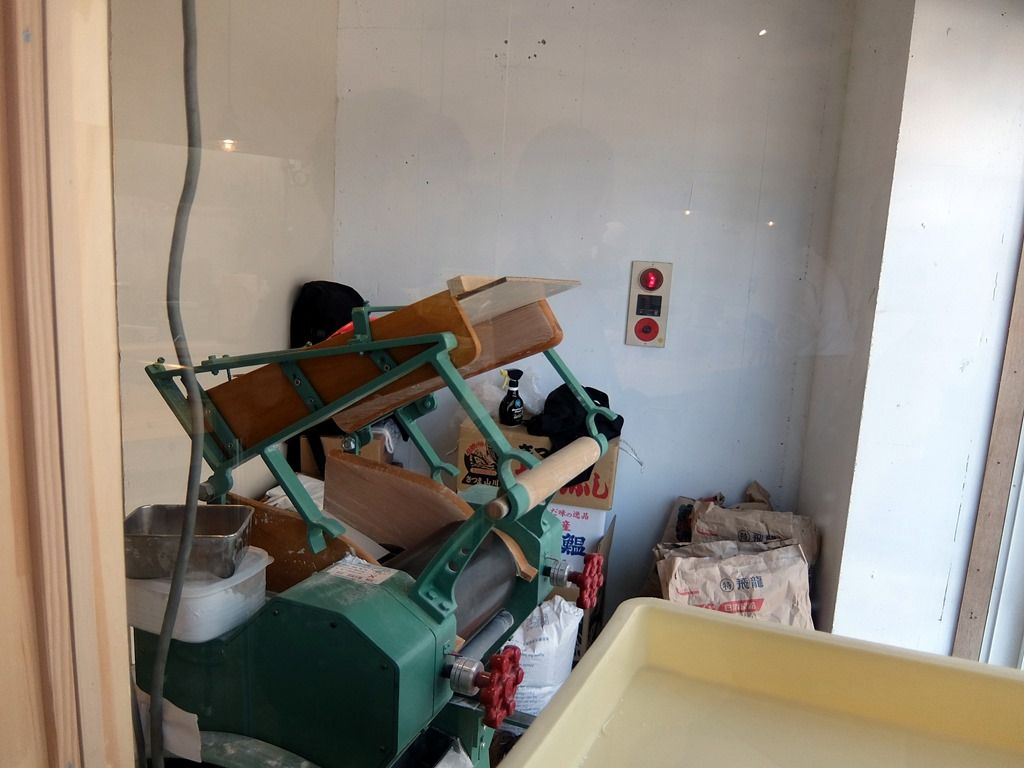 店内は、入口入って右手にガラス張りの製麺室。 製麺機はなんとべんてんで使用していた機体そのもで、オーバーホールして使用!