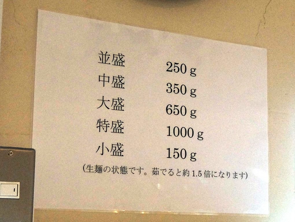 各メニューに小サイズもあって、小は100円引き。 麺量はゆで前で、並盛250g、中盛350g、大盛650g、特盛1000g、小盛150g。