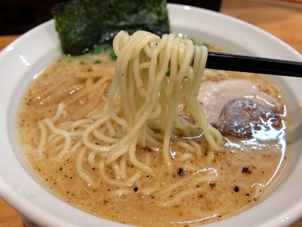 麺は中太で、かすかに縮れのあるタイプ。 デフォでかなりの固ゆでで、後20秒位ゆでた方が、さらに美味しくいただけそう。