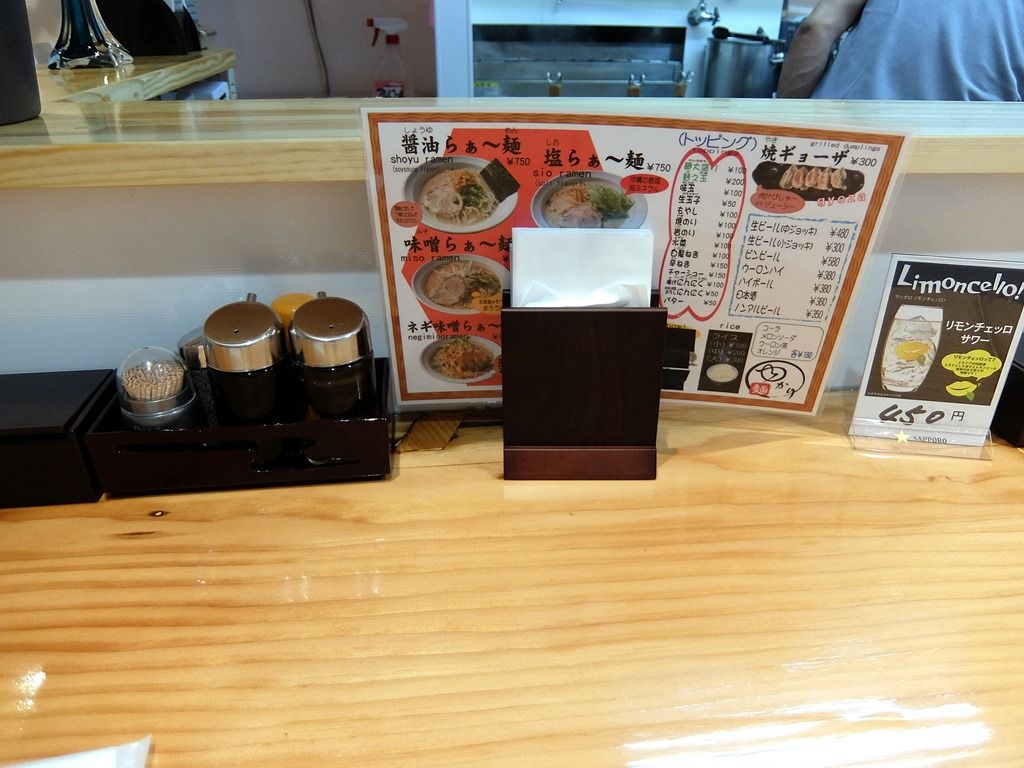 主なメニューは、醤油らぁ~麺810円、塩らぁ~麺810円、味噌らぁ~麺918円、ネギ味噌らぁ~麺918円、他。いきなり、メニューの種類が多いっすね!で、麺類のメニュー名は、「らぁ~麺」とまるで武蔵みたいw そして、外税表記にしてみましたが、結構な割高感。オーダーは、メニュー先頭の「醤油らぁ~麺」にしました。