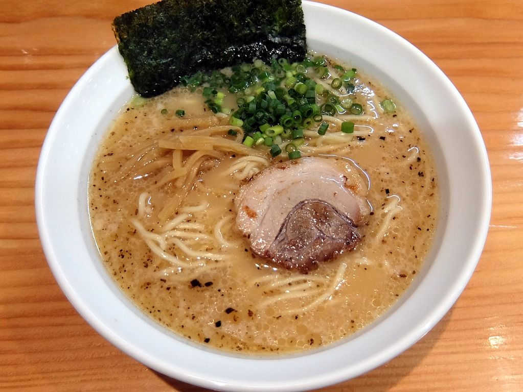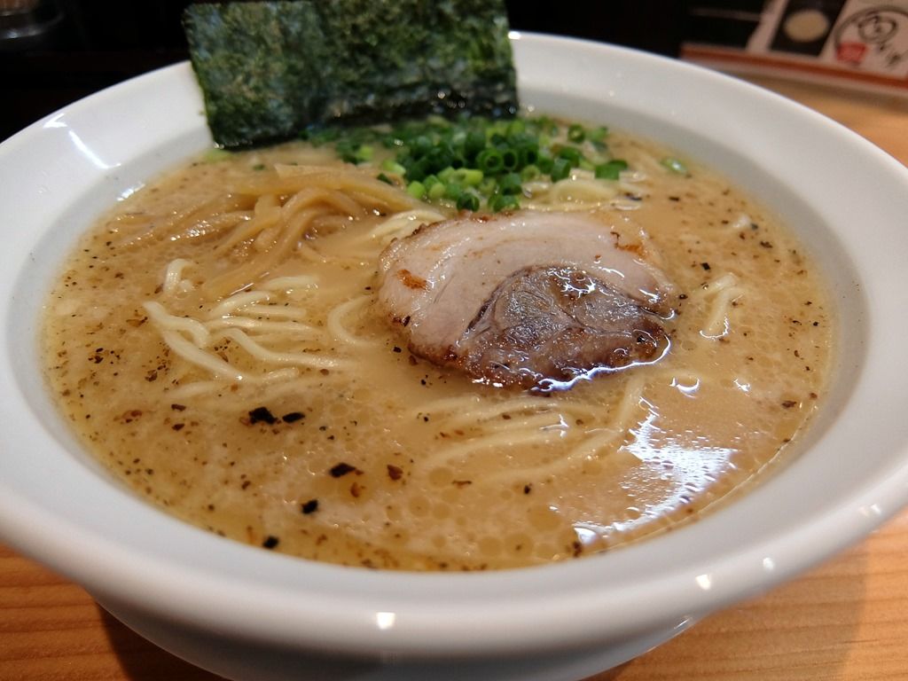 受皿つきの白い鳴門丼で登場。 具は、海苔、チャーシュー、メンマ、万能ねぎ。白濁した豚骨スープで、上からまるで背脂のようにパッパッとマー油が振りかけられていて、ちょっとあまり見ないビジュアル。