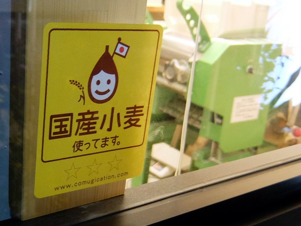製麺室のガラスには、「国産小麦使ってます。」のステッカー貼り付け。