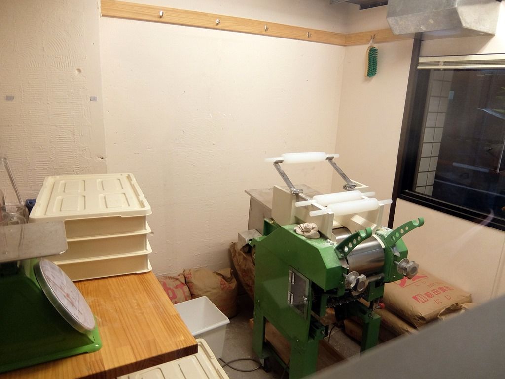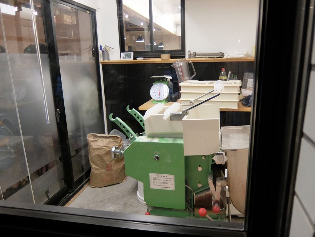 向かって入口右側が、ガラス張りで外から見える製麺室になっています。