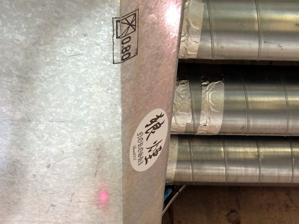 天井のダクトの排煙設備に「狼煙」のステッカー。