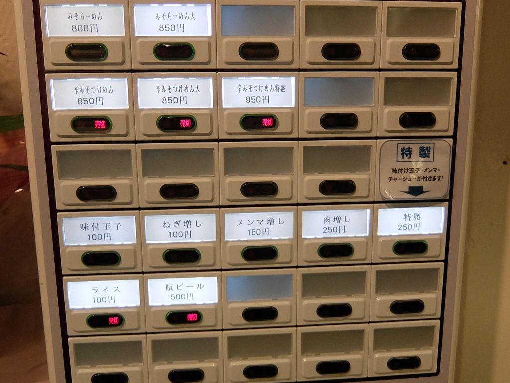 主なメニューは、みそらーめん800円、辛みそつけめん850円、他。ですが、つけめんは売切表示で準備中。って事で、オーダーは「みそらーめん」に。