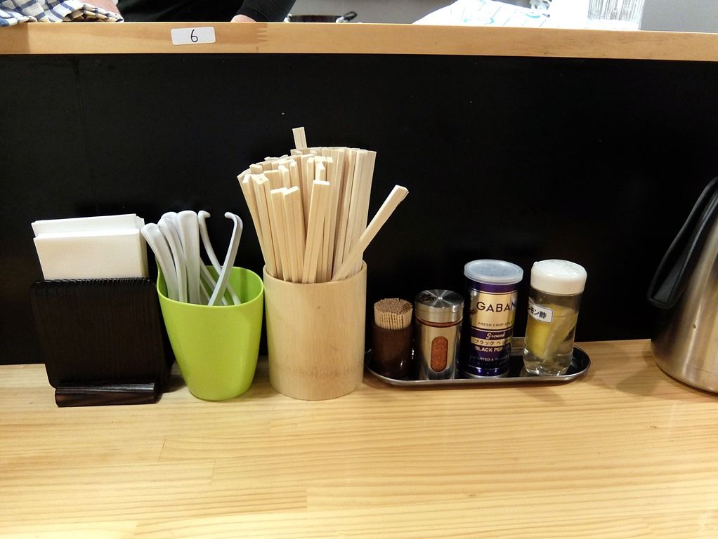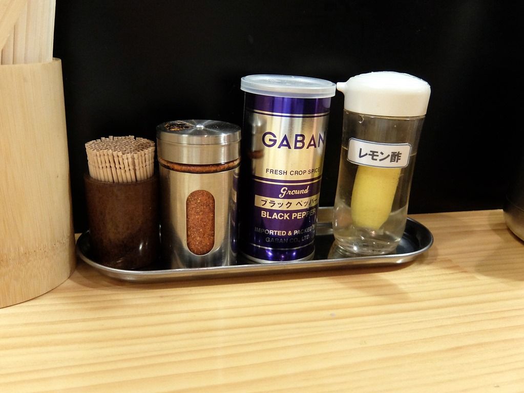 卓上調味料は、一味唐辛子、GABANブラックペッパー、レモン酢。