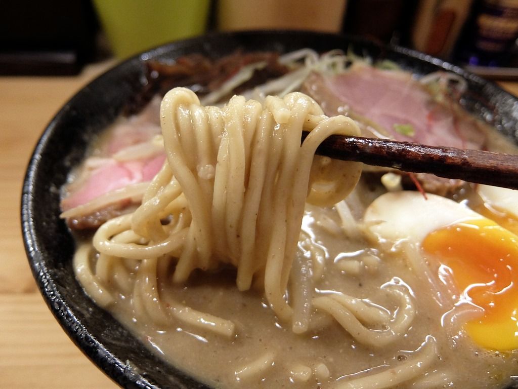 濃厚こく旨スープをがっしり受け止めて、スープに負けない存在感を発揮しています。