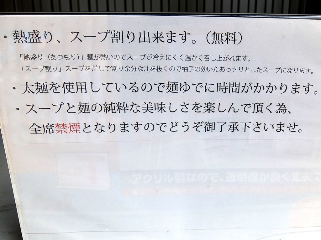 プレオープンってで未提供はもちろんですが、時間が遅いんで売切れたってのもあるかもしれません。順番が近くなってくると注文を聞かれます。つけ麺・あつそばは以前食べていたので、オーダーは「辛あつそば」にしました。
