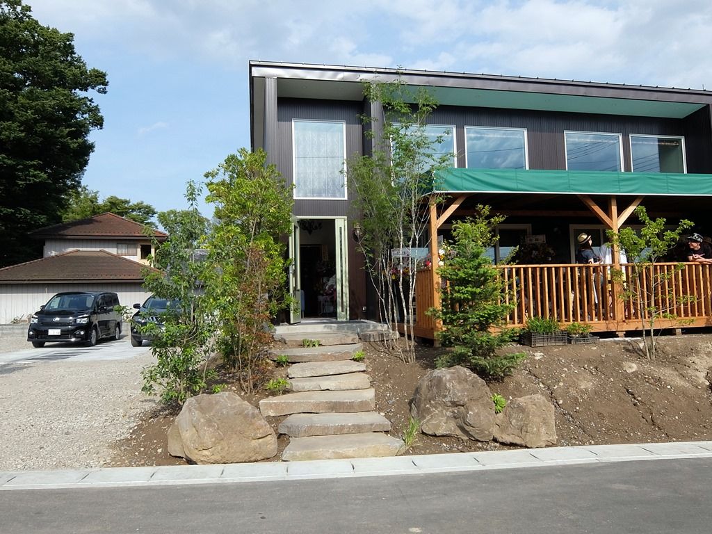 店舗は、濃い茶色で、大きなウッドデッキとその上のグリーンのテントが印象的。