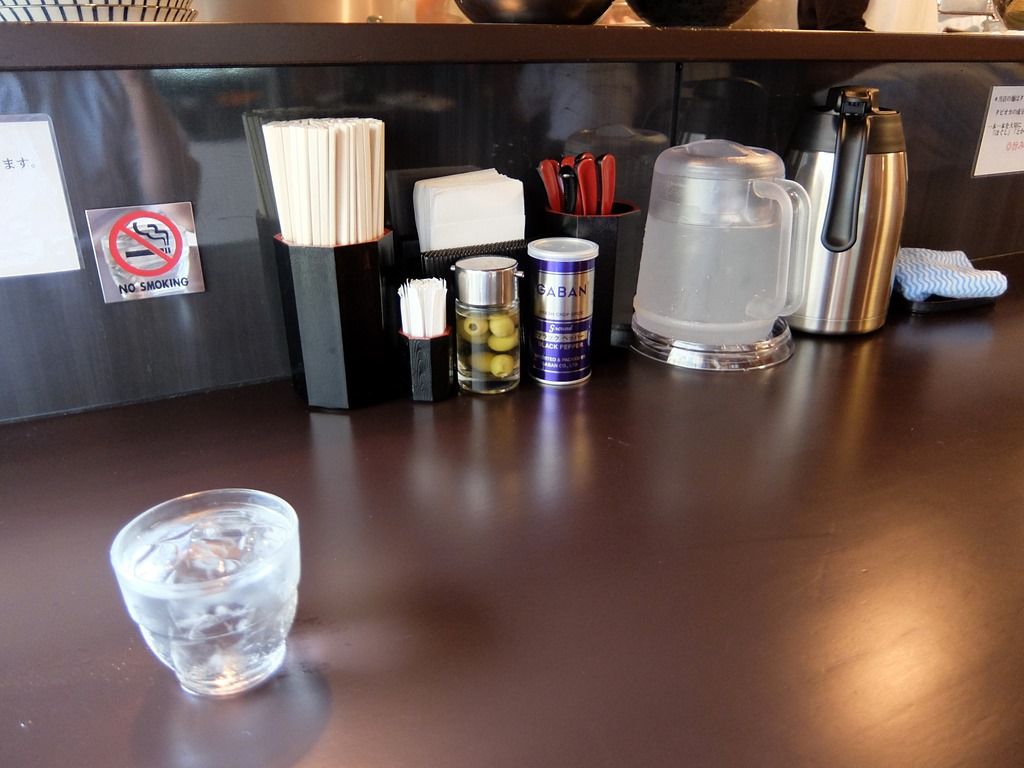 スープ割りは、卓上のポットからセルフで。 ポットの割りスープは、完全に透明な魚介清湯はんなり塩味。