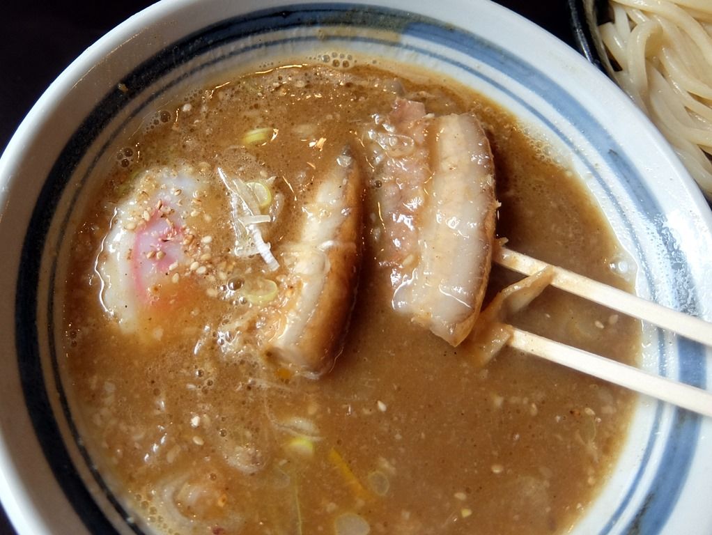 つけ汁の中の具は、なると、メンマ、ブロック状のチャーシュー、ほぐし豚、きざみネギ、ゆず皮。 チャーシューは、「三枚バラ肉、肩ロース2種を使った厚切り蒸しチャーシュー」とのことですが、ほぼ巨大な脂身の塊。
