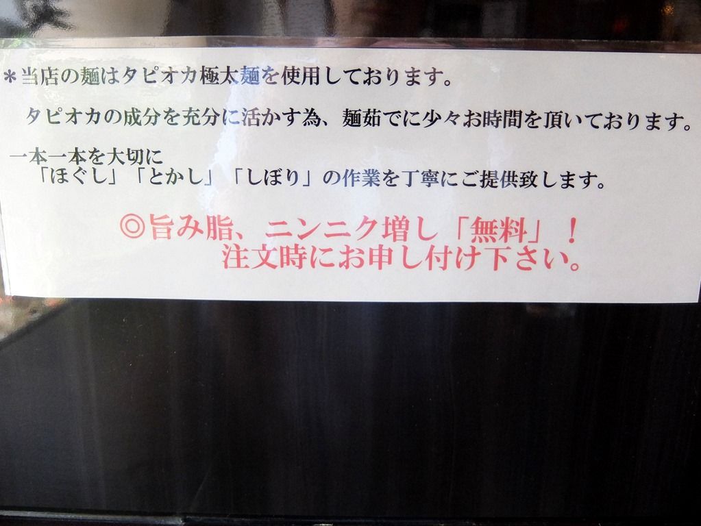 カウンターには、タピオカ極太麺使用のため、麺茹でに時間がかかる旨の掲示。 また、旨み脂、ニンニク増し無料のインフォも。