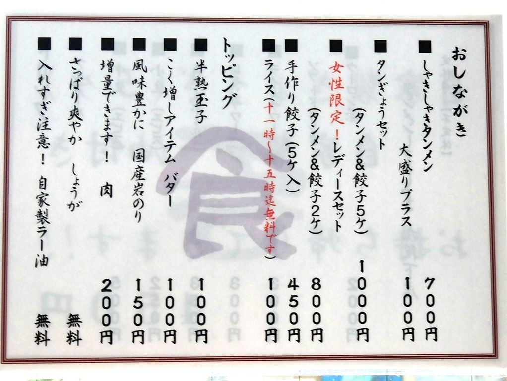 「レデースセット」は、やっぱり女性限定だそうです。昼からそんなにガッツリとはイケないので、オーダーは「タンメン」にしました。
