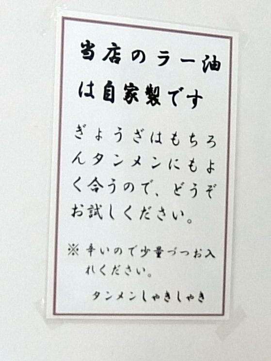 壁面には、ラー油自家製のインフォ掲示。 他には、餃子・ラー油お持ち帰り可能の掲示もありました。