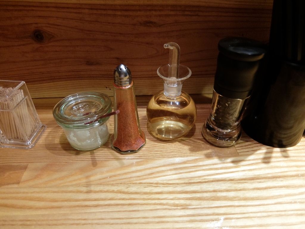 卓上調味料は、おろしニンニク。一味唐辛子、酢、ミル入りブラックペッパー。