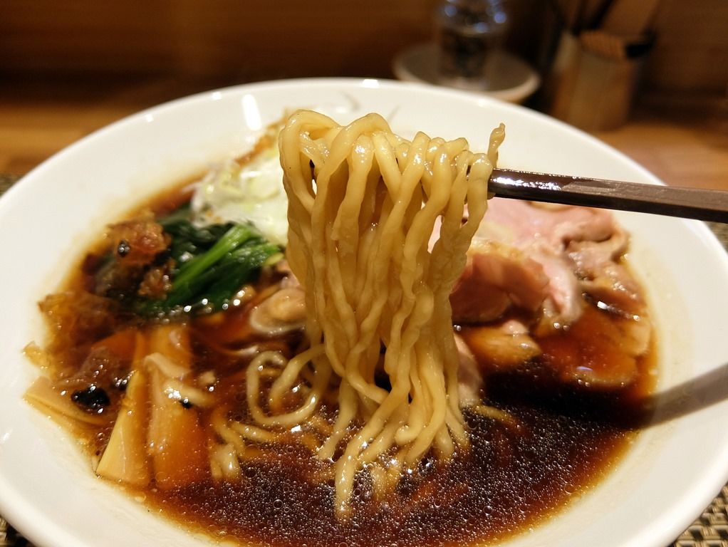 麺は、山口や製麺の中太縮れタイプ。 加水高めで、しっかりとしたコシとモチモチっとした食感が楽しめます。