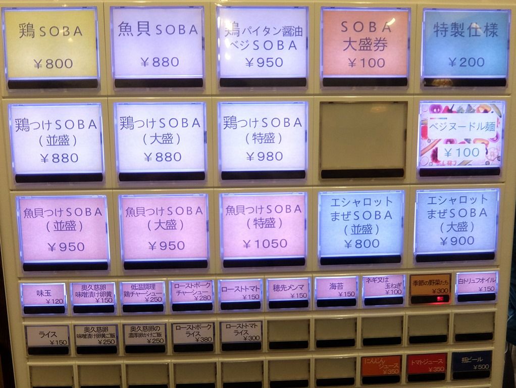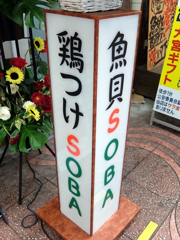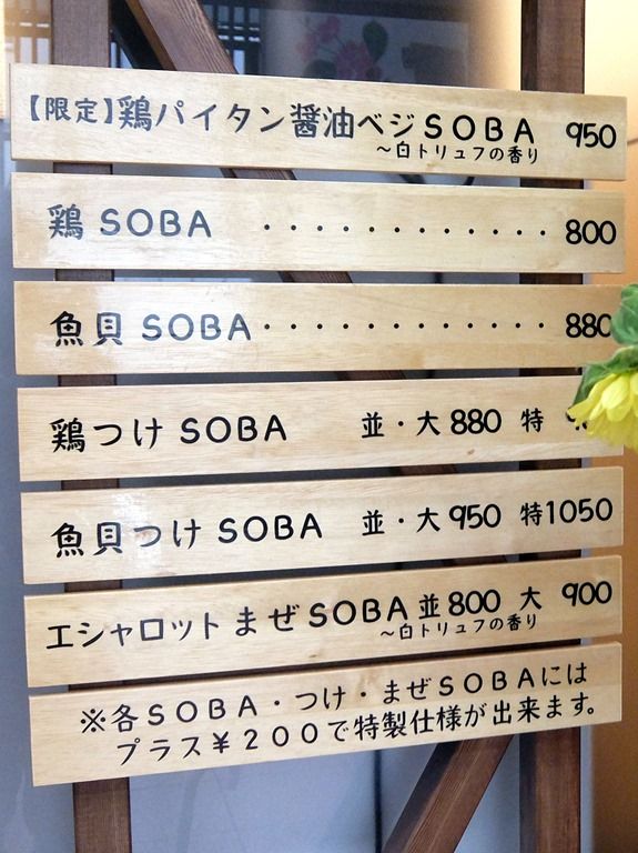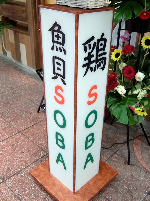 店頭スタンド看板には、「魚貝SOBA」「鶏SOBA」「鶏つけSOBA」の表記。