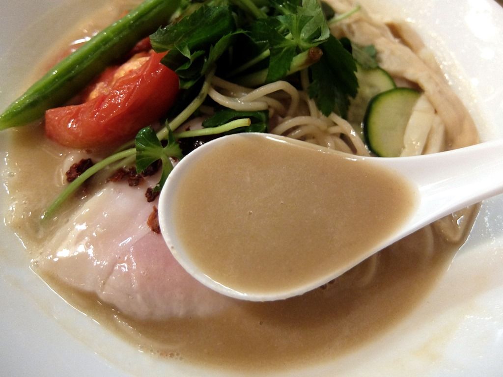 メニュー説明によると、「~鶏SOBAのスープを更にジックリと時間をかけ。濃厚な白湯スープに仕上げた究極の濃厚スープ。野菜の麺を合わせた限定販売です。~」とか。