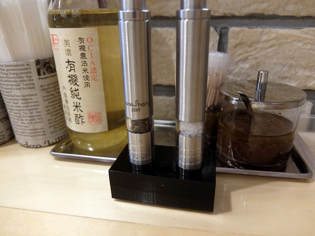 卓上調味料は、有機純米酢、ミリ入りブラックペッパー、ミル入り岩塩、自家製エシャロットオイル。