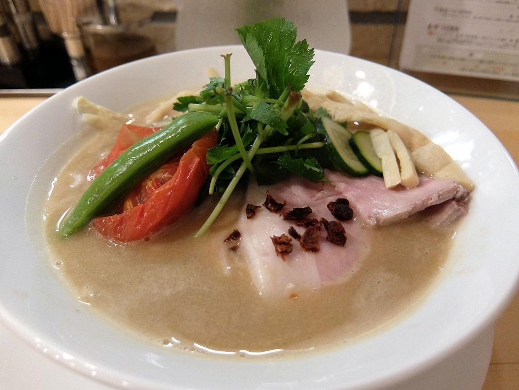 具は、三つ葉、さやえんどう、ローストマト、穂先メンマ、ズッキーニ、鶏チャーシュー、豚チャーシュー、穂先メンマ、揚げネギ。