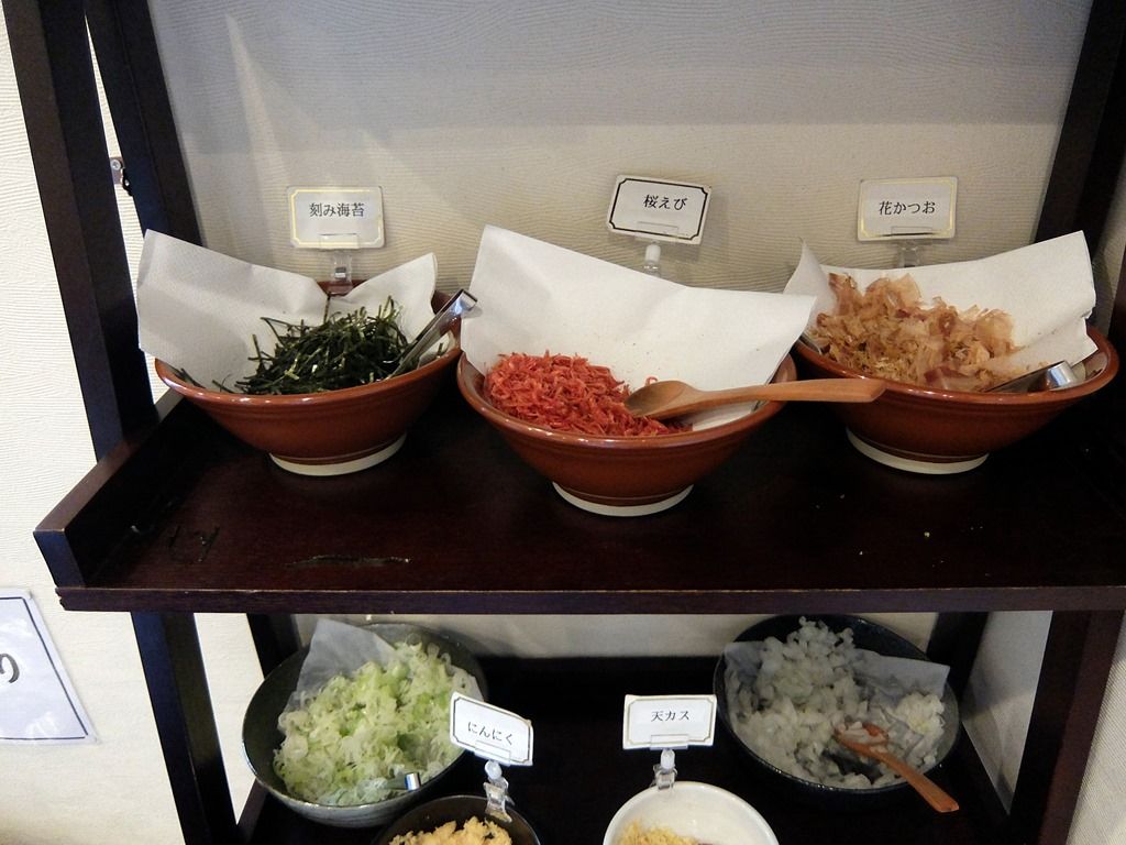 無料トッピングの内容は、きざみ海苔、桜えび、花かつお、