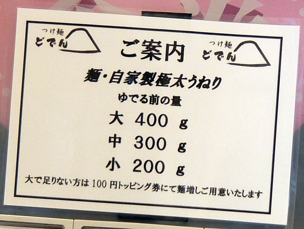 「自家製極太うねり」という麺の麺量は、ゆで前で大400g、中300g、小200g。