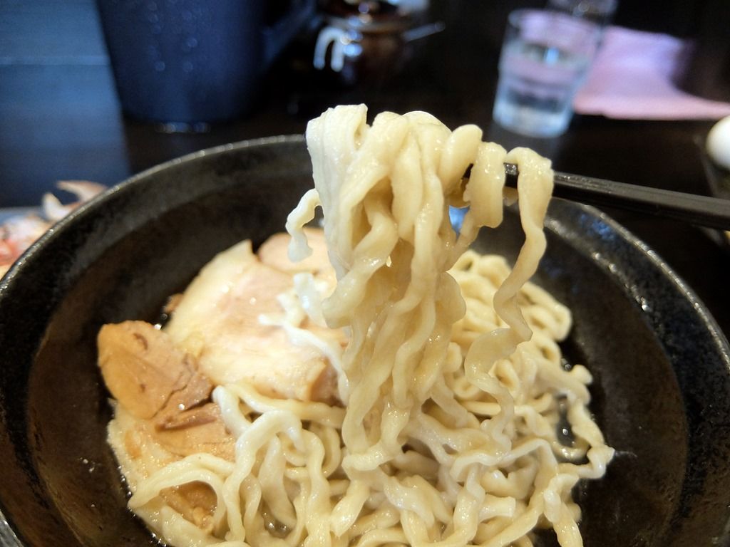 自家製の麺は、烈な縮れのついた極太タイプ。 強靭なコシがあり、かなり顎が鍛えられるというか、顎が疲れるタイプ。
