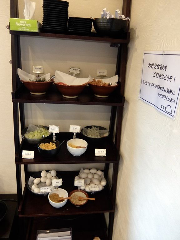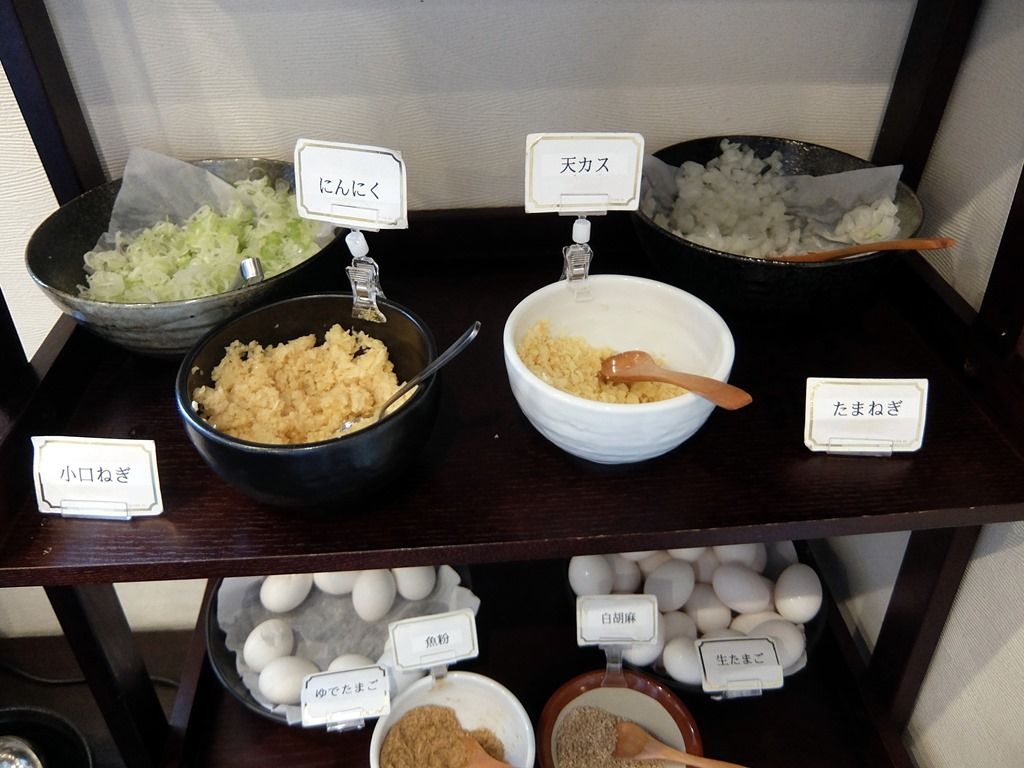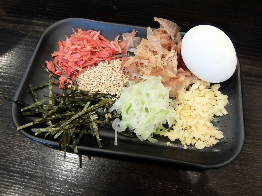 そしてスタンバイしたフリートッピングこちら。 桜えび・胡麻・花かつお・生玉子、きざみ海苔、ネギ、天カスを用意。