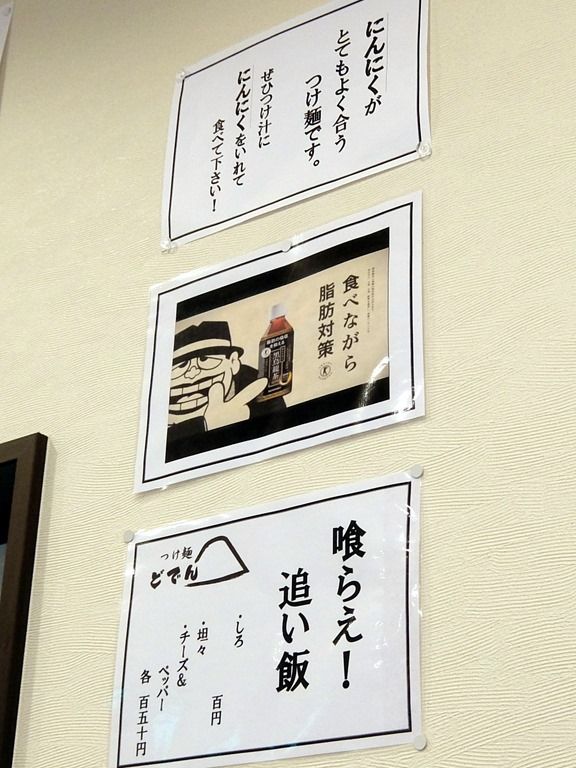 主なメニューは、極・どろつけ麺 小800円 中・大850円、旨・辛つけ麺 小800円 中・大850円、他。 二郎系の店らしく、黒烏龍茶170円、伊右衛門特茶190円もオンストア。