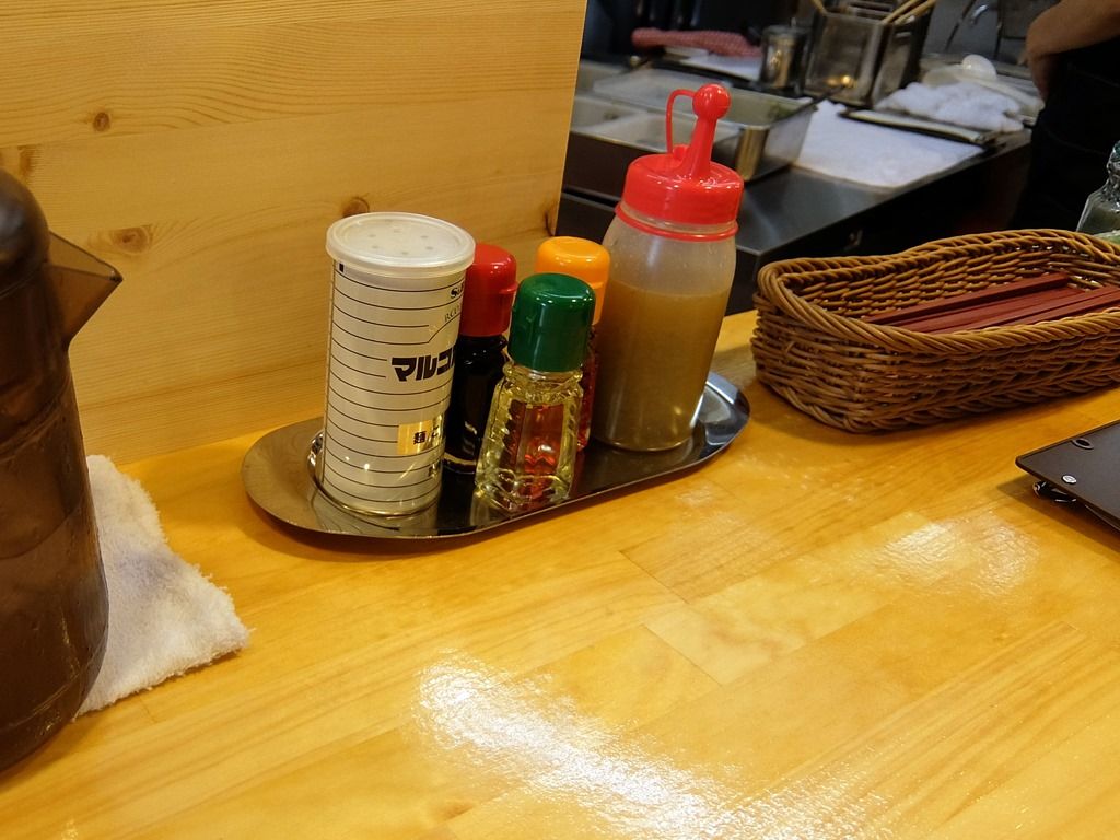卓上調味料は、マルコポーロこしょう、醤油、酢、ラー油、柚子胡椒酢。