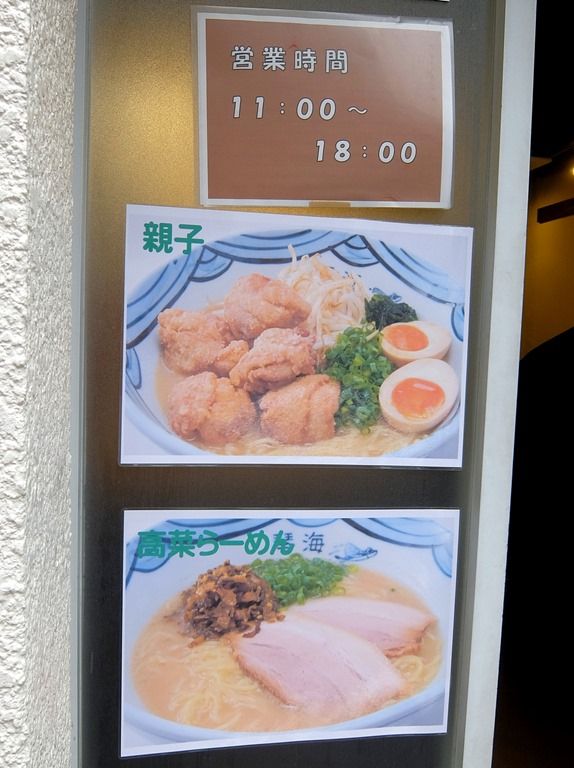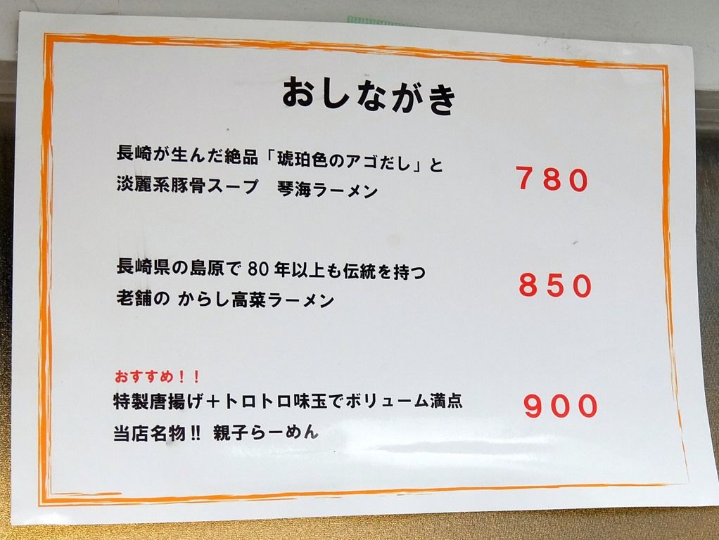 メニューは、琴海ラーメン780円、からし高菜ラーメン850円、親子ラーメン900円、大盛・替玉100円。「親子ラーメン」は、から揚げ+味玉入り。