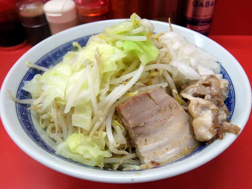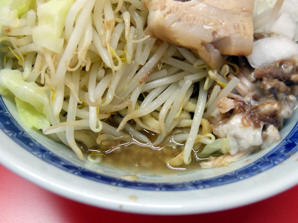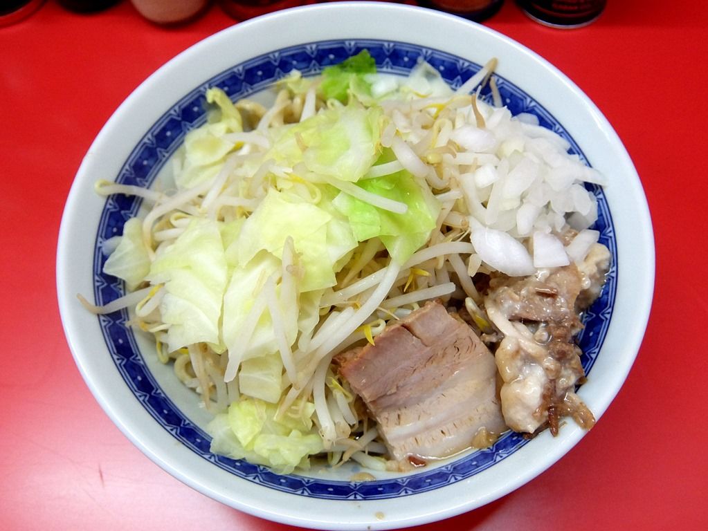 具は、ヤサイ(モヤシ・キャベツ)、ブタ、無料トッピの玉ねぎ。ヤサイマシがないためか、モヤシに比してキャベツの量がかなり多いのが特徴的。