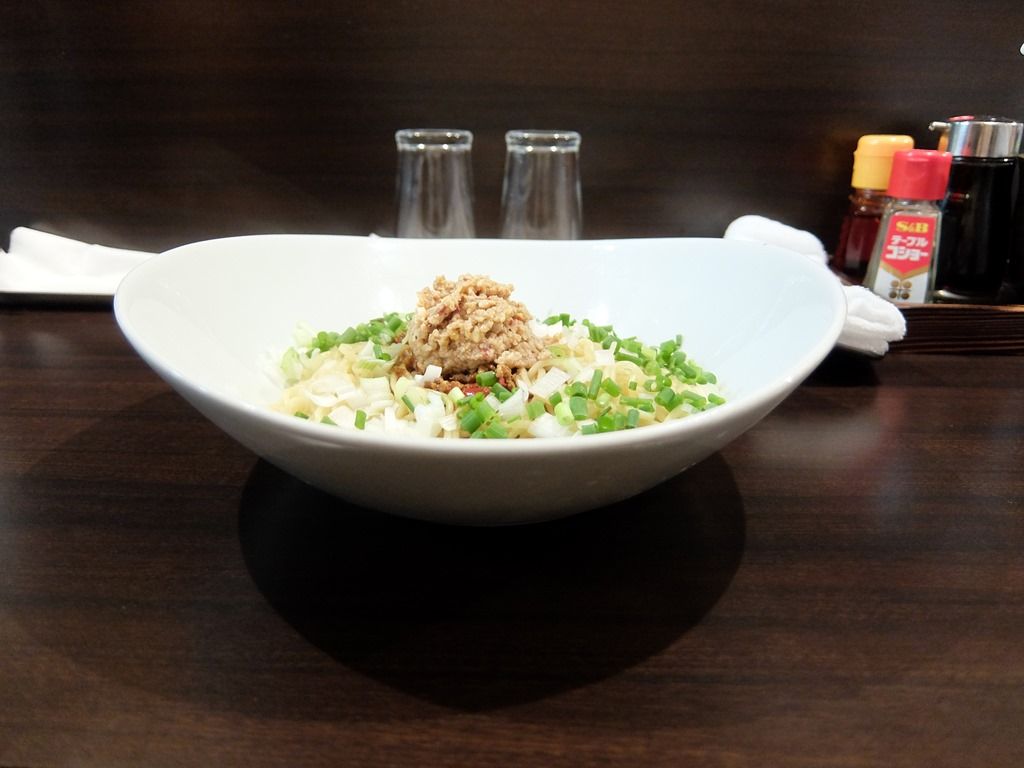 カレー皿かパスタ用皿の様な、楕円形の平皿で登場。 具は、中央に肉味噌ボール、きざみ白なぎ・青ねぎ。