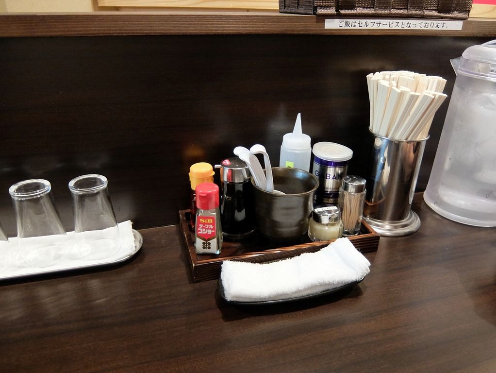 卓上調味料は、ラー油、S&Bコショー、醤油、酢、GABANホワイトペッパー。