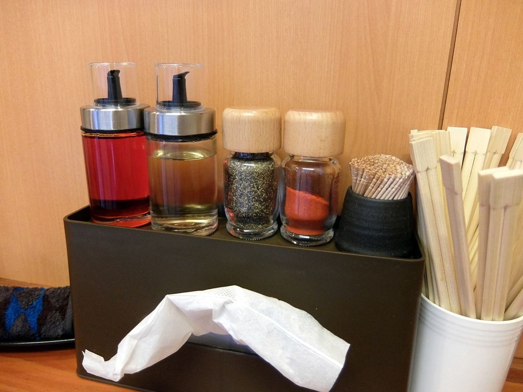 卓上調味料は、ラー油、酢、ミックスペッパー、一味唐辛子。