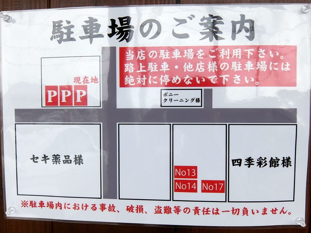 駐車スペースは店頭に3台、道路挟んで斜め向かいの駐車場に3台分あり。 向かいにセキ薬品の広々とした駐車場がありますが、無断駐車は絶対にまずいです!