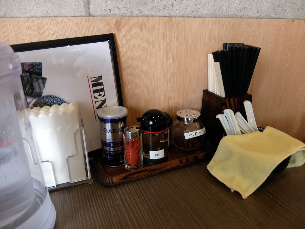 卓上調味料は、GABANブラックペッパー、一味唐辛子、酢。