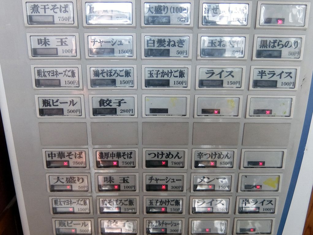 主なメニューは、煮干そば750円、濃厚煮干そば750円、混ぜ玉(120g)150円、明太マヨネーズご飯150円、鶏そぼろご飯150円、玉子かけご飯150円、ライス150円、(以下売切表示)餃子280円、中華そば750円、濃厚中華そば750円、つけめん780円、辛つけめん850円、他。