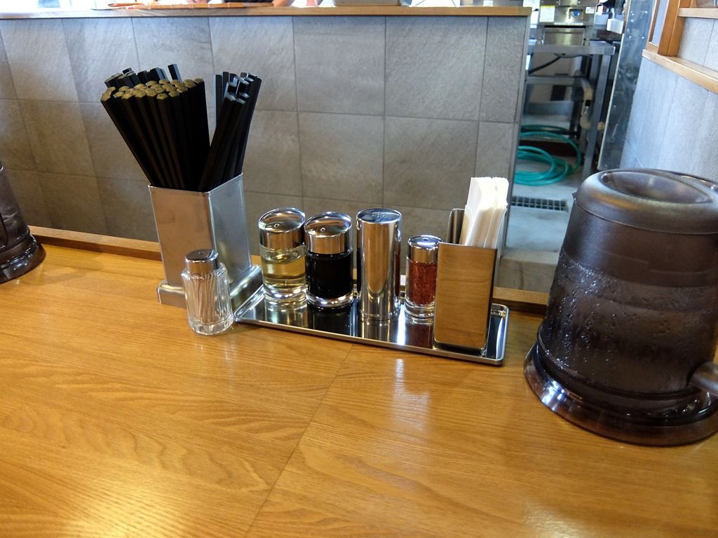 卓上調味料は、酢、醤油、白胡椒、一味唐辛子。