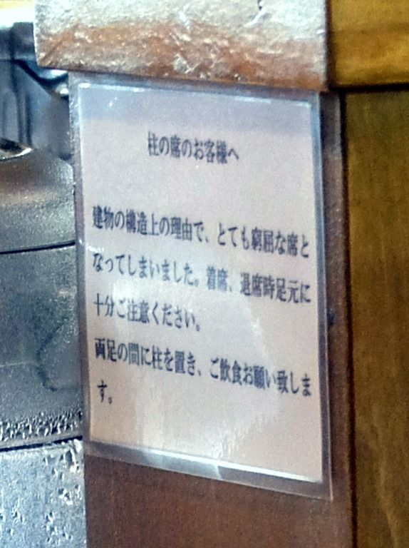 柱に何やら掲示してあって、ちょっとズームインw 柱の前の席は、着席すると両足の間に柱が来ちゃうみたいです。