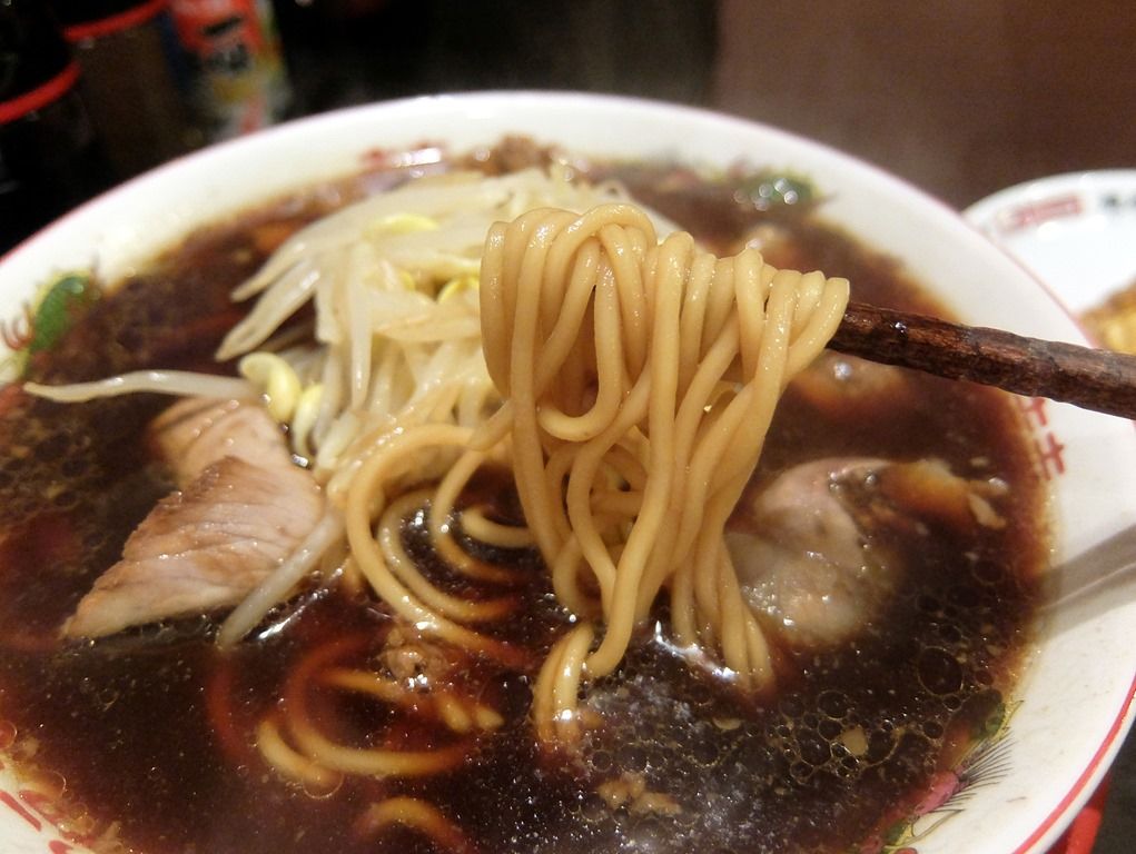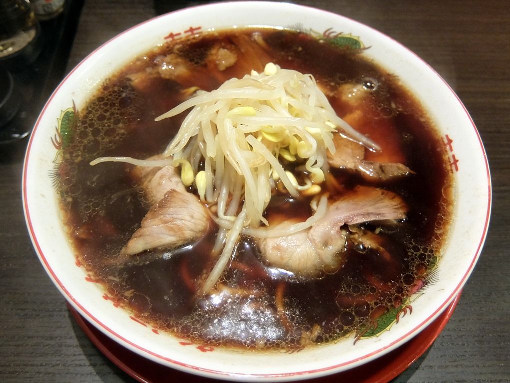 新福菜館の特徴は、真っ黒なスープにたっぷりの九条ねぎですが、この日はネギが売り切れて「中華そば(ネギ抜き)」での提供。ただし、注文時や提供時に特に説明は無く、会計時に「本日ネギ売り切れでネギ無しになりましたので50円お引きします」との説明。ワタシはレジが近くて聞こえてたので、心の準備?は出来てましたが、注文品が出てきて初めて知ってガッカリした人もいるかも。ってか、京都のラーメンで九条ねぎ抜きって、残念至極。