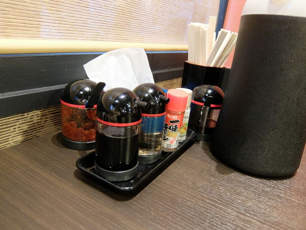 卓上調味料は、醤油、酢。ラー油、一味唐辛子、ホワイトペッパー、豆板醤。