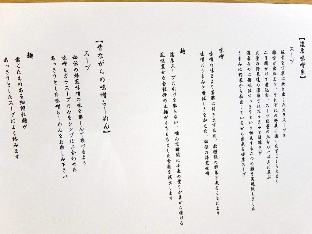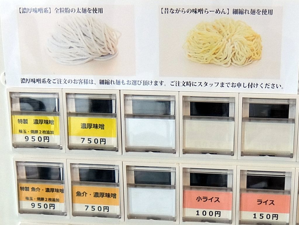 2015年8月16日~21日プレオープン、8月24日グランドオープンの味噌ラーメン専門店。8月22日当日オープンの煮干そば 金狼の後に訪問してフラれ歴イチ。後で確認したところ、ツイッターでしっかりアナウンスがあったので、単なるワタシのチェック漏れという(´・ω・`) この日ようやくリベンジに訪問w