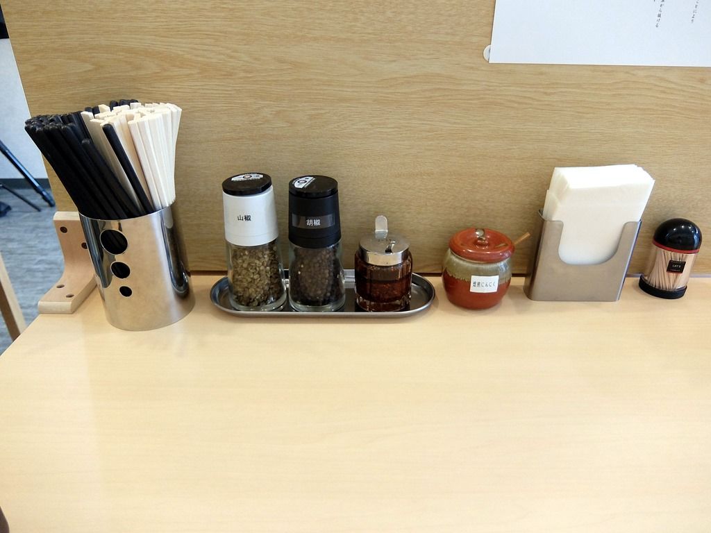卓上調味料は、ミル入り山椒・粒黒胡椒・ラー油・焙煎にんにく。 焙煎にんにくは、揚げにんにくチップのドライバージョン的な感じ。