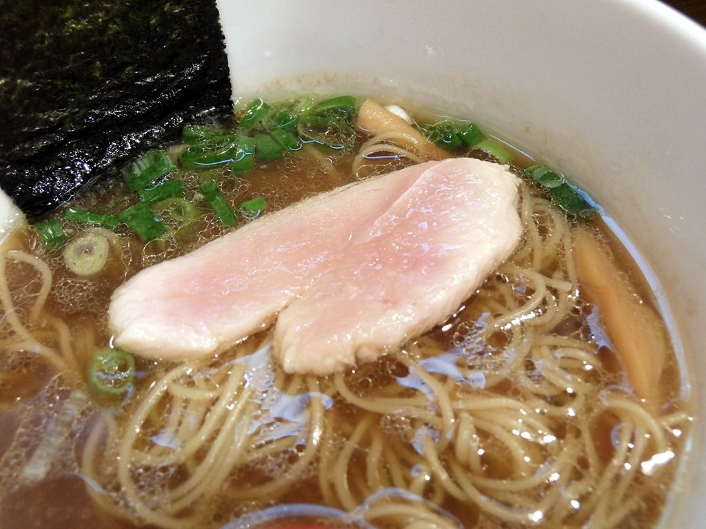 「鯱」の時は黒いどっしりとした反高台丼でしたが、今回はシンプルな白い切立丼で登場。 具は、海苔、鶏チャーシュー、メンマ、きざみネギ。