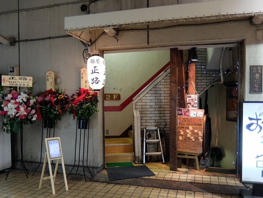 店はビルの2階ですが、1階入り口脇にある「麺屋 正路」の提灯と立看板が目印。