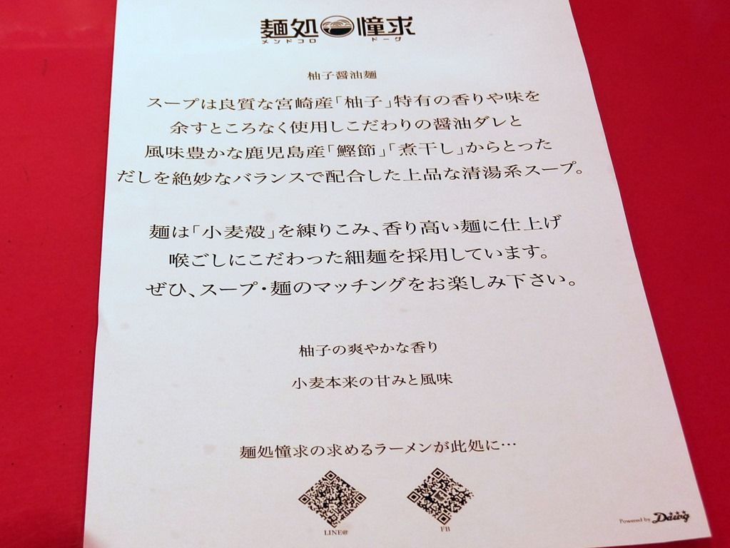 スープは、鹿児島産鰹節・煮干しの出汁に、宮崎産柚子の香りや味を移した醤油ダレを配合とか。