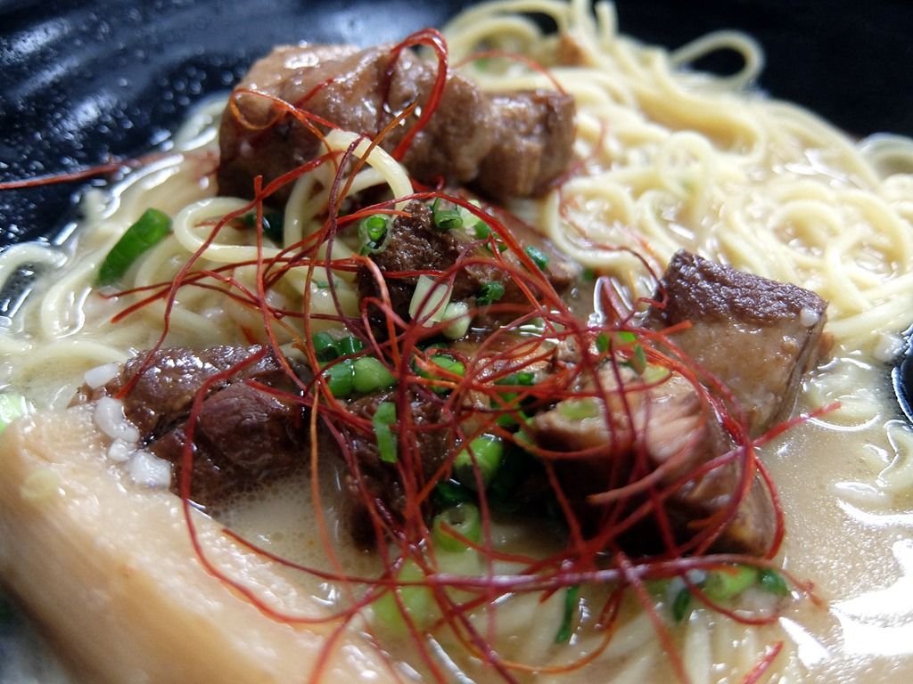 グループ店同様黒い丼で登場。 具は、糸唐辛子、豚角煮、メンマ、あさつき。