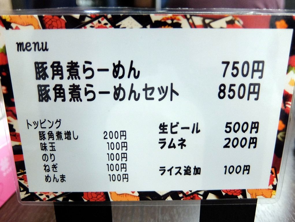 主なメニューは、豚角煮らーめん750円、豚角煮らーめんセット850円、他。 セットは、ラーメンに高菜ご飯 or 明太ご飯が付いて+100円とお得!