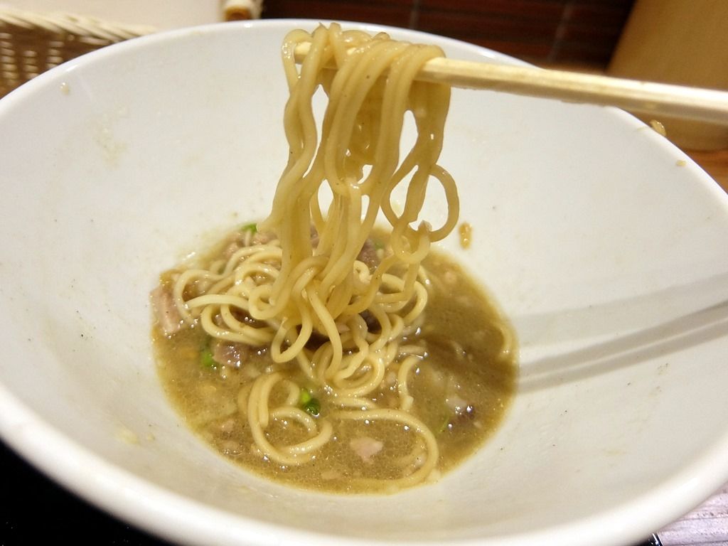 途中で、残しておいた「煮干そば」のスープに浸けて「煮干つけ麺」としていただきます。 ラーメンスープですので、つけだれとしてはやや薄いですが、ニボスープxニボ油だれでこちらも旨い!